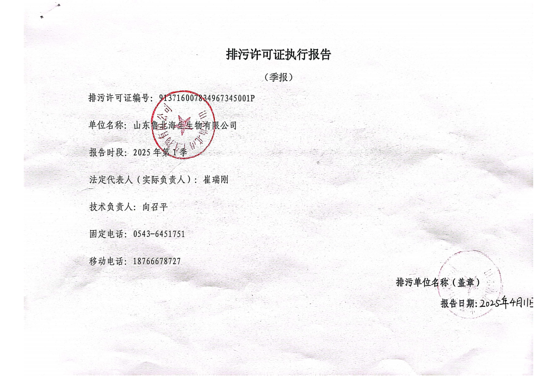山東魯北海生生物有限公司2025年第一季度排污許可證執(zhí)行報(bào)告